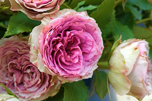 หรรษา ที่เริ่มบานเป็นสีครีมอ่อนแล้วเปลี่ยนเป็นสีชมพูเมื่อกลีบเริ่มเปิด กลิ่นหอมชัดเจน, เพียงจันทร์ กุหลาบสีเหลืองสุกสว่างสดใส และ เพชรธารา กุหลาบสายพันธุ์เลื้อยที่บานอย่างงดงามราวกับภาพวาด ด้วยกลีบขนาดใหญ่ที่มีสีชมพูและเฉดสีเข้มอยู่ภายใน