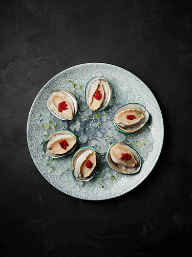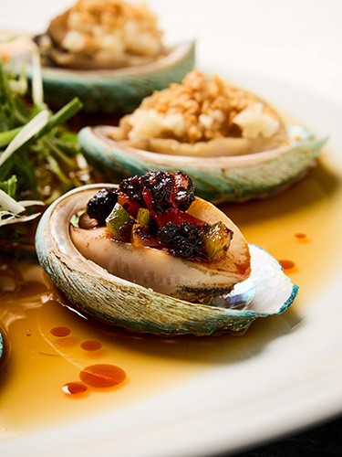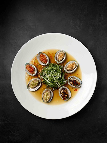 • หอยเป๋าฮื้อนึ่งกระเทียมและซอสถั่วเหลือง