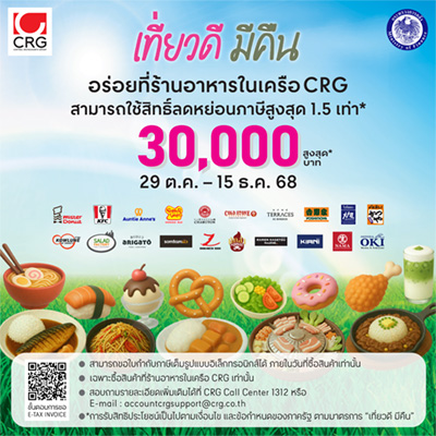 บริษัท เซ็นทรัล เรสตอรองส์ กรุ๊ป จำกัด ขานรับมาตรการรัฐกระตุ้นเศรษฐกิจ เข้าร่วมโครงการ “เที่ยวดี มีคืน” สามารถใช้สิทธิ์ลดหย่อนภาษีสูงสุด 1.5 เท่า ตามมาตรการ เมื่อซื้อสินค้าตั้งแต่วันที่ 29 ตุลาคม – 15 ธันวาคม 2568