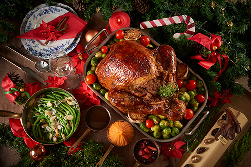 ซุปฟักทอง ไก่งวงอบ แฮมอบมัสตาร์ดน้ำผึ้ง และ Duck Roulade เสิร์ฟพร้อมเครื่องเคียงแสนอร่อย เช่น ฟักทองบัตเตอร์นัทย่าง มันหวานทอด เบบี้แครอทย่างราดซอสบัลซามิก Parsnip Gratin รสละมุน Brussels Sprouts ย่าง ถั่วแขกอบซอส มันฝรั่งบด และ Stuffing เสิร์ฟคู่กับซอสแครนเบอร์รีและ Giblet Gravy