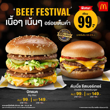 มาอร่อยเต็มคำแบบเนื้อๆ เน้นๆ กับ บิกแมค และ ดับเบิ้ลชีสเบอร์เกอร์ ในราคาพิเศษ! เริ่มต้นเพียงชิ้นละ 99 บาท หรือเลือกอร่อยครบชุดพร้อมเฟรนช์ฟรายส์และเครื่องดื่มเริ่มต้นชุดละ 149 บาท ได้แล้ว ตั้งแต่วันนี้ – 4 มกราคม 2569 ที่ร้านแมคโดนัลด์ทุกสาขาที่ร่วมรายการ และ บริการแมคไดร์ฟ ทรู